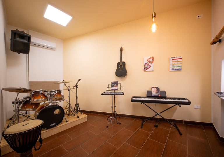 La nostra accademia è situata in un ambiente accogliente e professionale, ideale per l'apprendimento delle percussioni e il benessere personale attraverso la attività di gruppo.